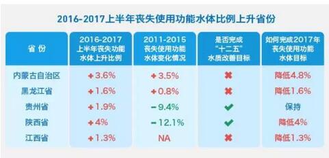 據(jù)通報,內(nèi)蒙古`、黑龍江、江西、貴州、陜西5省喪失使用功能水體均有所上升。